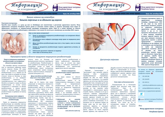 Podsjećamo, od novembra, između ostalog, osiguranici će imati više prava u oblasti produžene medicinske rehabilitacije. Naime, osiguranici koji su preležali infekciju virusa korona, nakon bolničkog liječenja na prijedlog ljekara, imaju pravo na produženu medicinsku rehabilitaciju u trajanju do 28 dana, a u slučaju potrebe i na obnovu rehabilitacije. Novina je i da će od novembra osiguranici nakon akutnog infarkta miokarda na prijedlog kardiologa, vaskularnog ili kardiohirurga moći da ostvare pravo na produženu medicinsku rehabilitaciju, dok su ranije ovo pravo imali samo osiguranici koji su imali operativni zahvat na srcu, poput ugradnje bajpasa, operacije na srčanim zaliscima i sl. Takođe, omogućeno je i da djeca do 15 godina koja imaju indikacije za medicinsku rehabilitaciju u izuzetnim situacijama mogu da ostvare pravo na rehabilitaciju više puta u toku godine i za to je potrebna samo uputnica porodičnog doktora, bez komisijskog odlučivanja. O ovim i drugim novinama, detaljnije se možete informisati u Informativnom letku, kao i u propisima FZO RS, koji su, takođe, dostupni na sajtu.