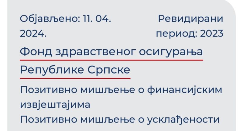 Fond zdravstvenog osiguranja Republike Srpske dobio je pozitivno mišljenje za finansijske izvještaje, kao i za usklađenost aktivnosti, Glavne službe za reviziju javnog sektora za 2023. godinu.