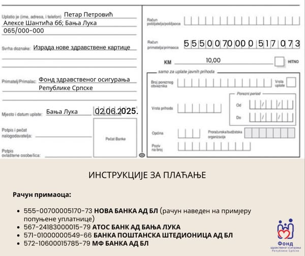 Uplatu za izdavanje nove kartice osiguranici će moći izvršiti na jedan od četiri računa FZO RS, u različitim bankama, a detalјna uputstva za plaćanje dostupna su i na internet stranici Fonda.